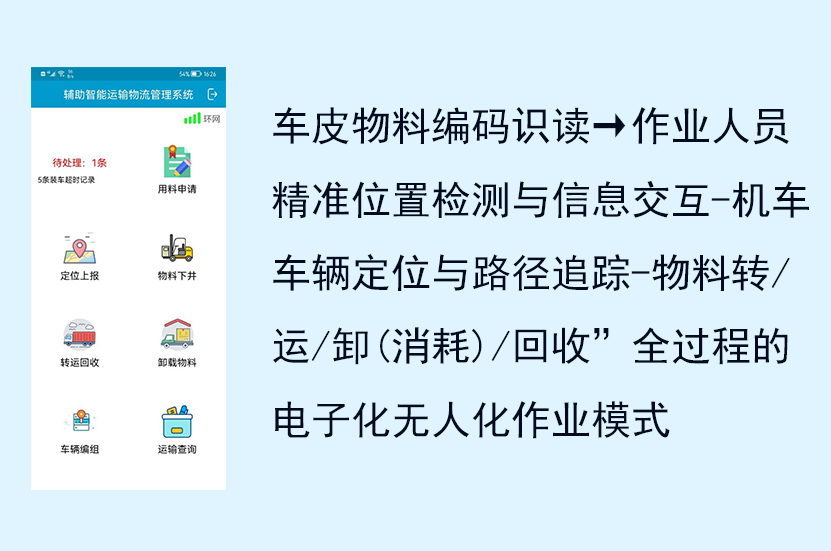 基于工业以太网和多功能融合基站,采用平台一体化集控设计,以物料申领计划为基础,通过与移动(含车载)终端、信号系统、物资仓储系统的配接及APP信息交互,实现了对车辆与物资的信息化管理、人员与车辆的作业联动,以及井下地轨机车、单轨吊车混合运行下的自主调度决策和安全高效管控,为张集煤矿的辅助运输智能、高效、安全运行保驾护航。
