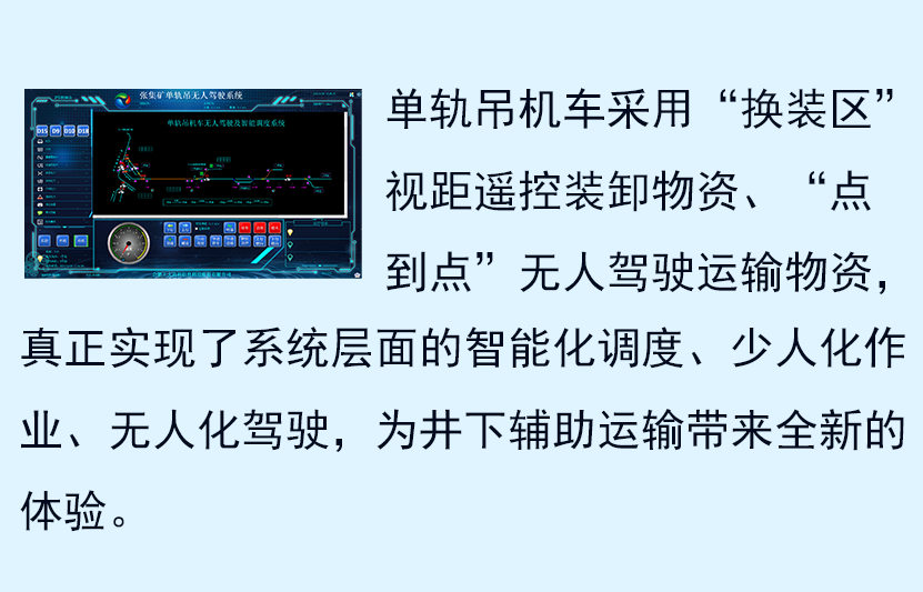 基于工业WiFi6无线通信网络,采用智能化自动驾驶技术和远程拟人化安全操作技术,并结合精确定位导航、路况及环境感知、路径规划等技术,实施对轨道道岔、巷道风门等关键装置的“安全通信+自动监控”,对单轨吊机车的“自主避障+自动驾驶”。