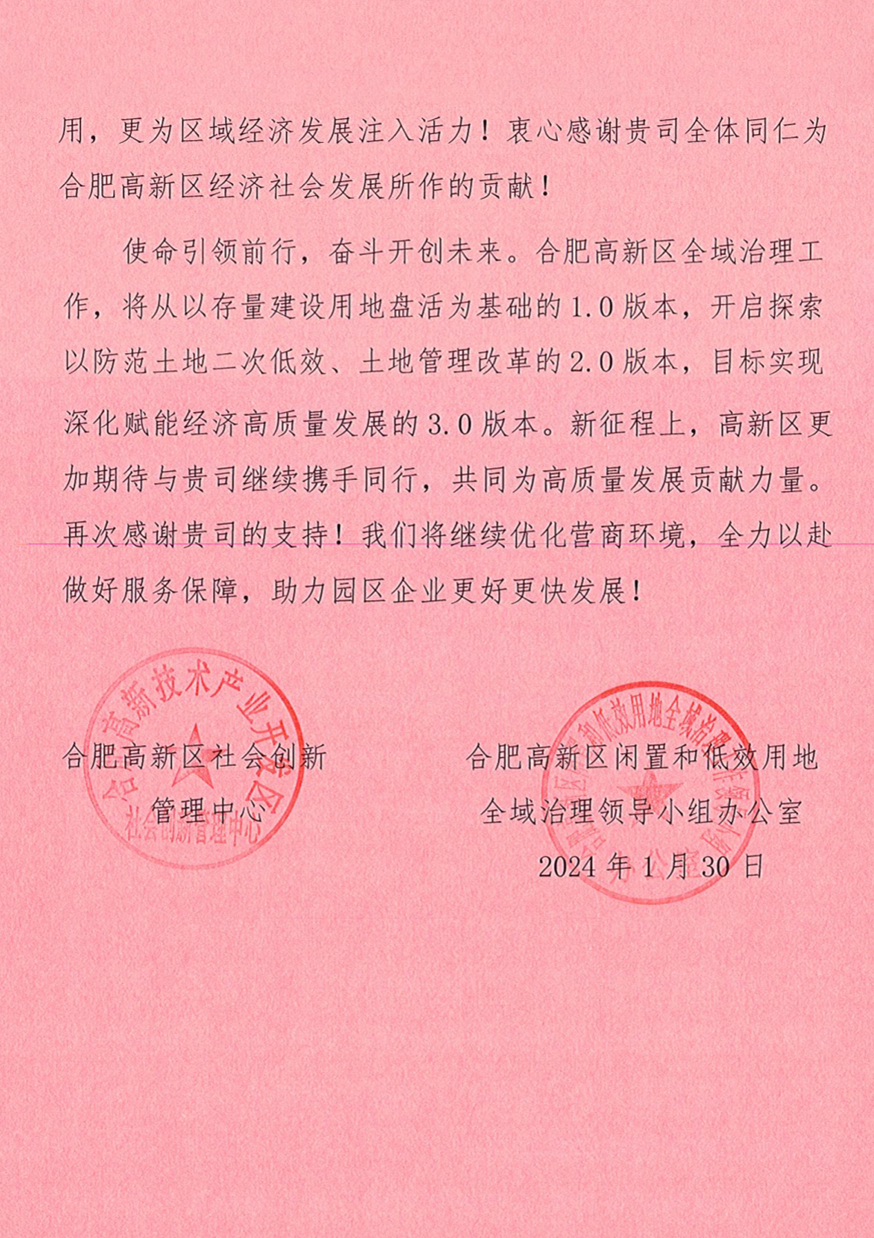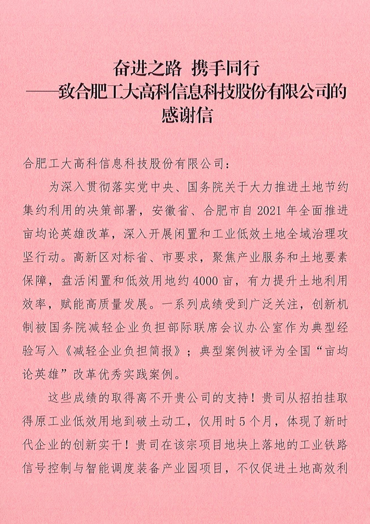 信中感谢了工大乐鱼给予的大力支持和全体同仁做出的积极贡献,在新征程上,期待与工大乐鱼继续携手同行,继续为合肥高新区高质量发展贡献力量。